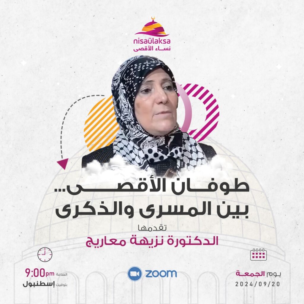 مؤسسة نساء الأقصى تدعو الجميع لحضور محاضرة متميزة بعنوان: “طوفان الأقصى.. بين المسرى والذكرى”، في ظل التهديدات المستمرة التي يتعرض لها المسجد الأقصى