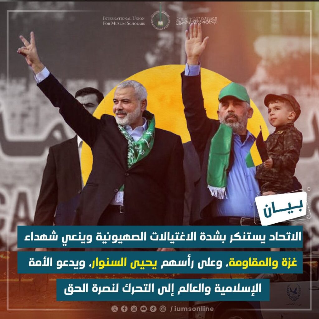الاتحاد يستنكر بشدة الاغتيالات الصهيونية وينعي شهداء غزة والمقاومة، وعلى رأسهم يحيى السنوار، ويدعو الأمة الإسلامية والعالم إلى التحرك لنصرة الحق