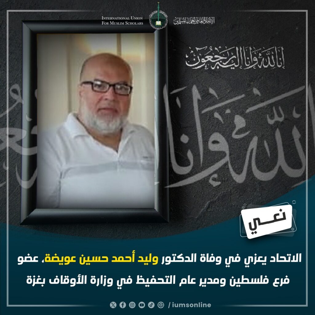 الاتحاد يعزي في وفاة الدكتور وليد أحمد حسين عويضة، عضو فرع فلسطين ومدير عام التحفيظ في وزارة الأوقاف بغزة