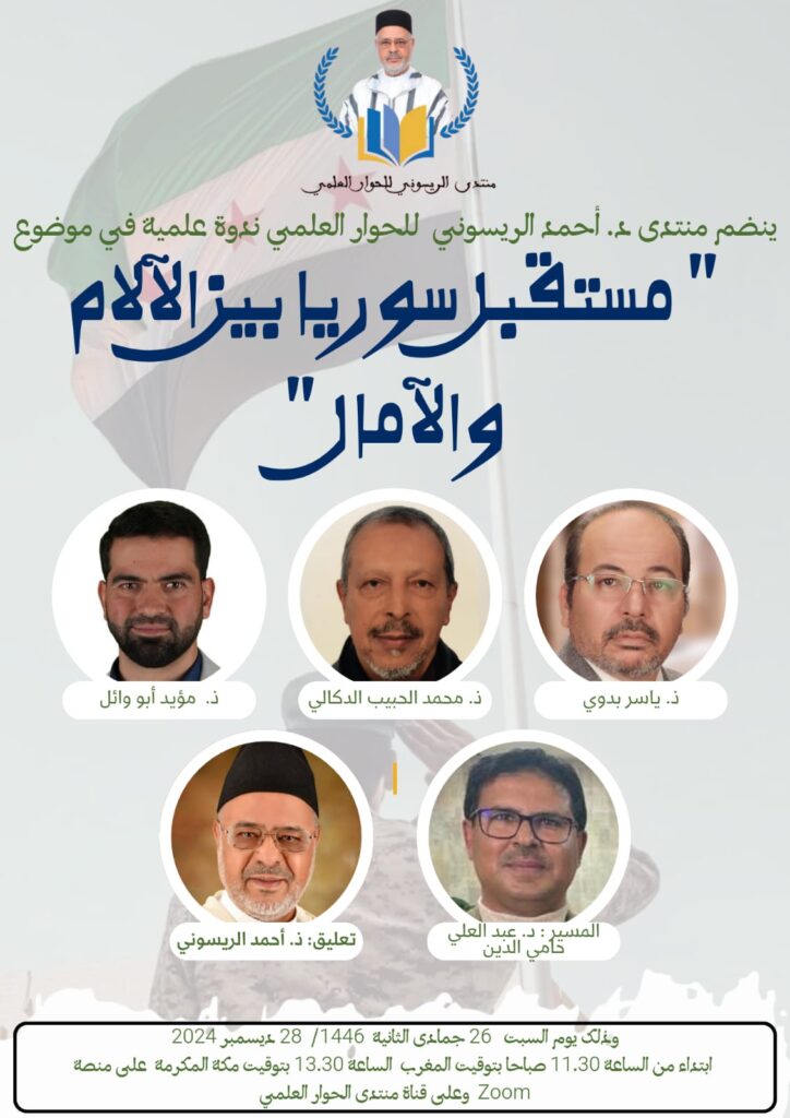 منتدى الريسوني للحوار العلمي ينظم ندوة علمية في موضوع: “مستقبل سوريا بين الآلام والآمال”، اليوم السبت 28 ديسمبر 2024م، الموافق 26 جمادى الآخرة 1446هـ.
