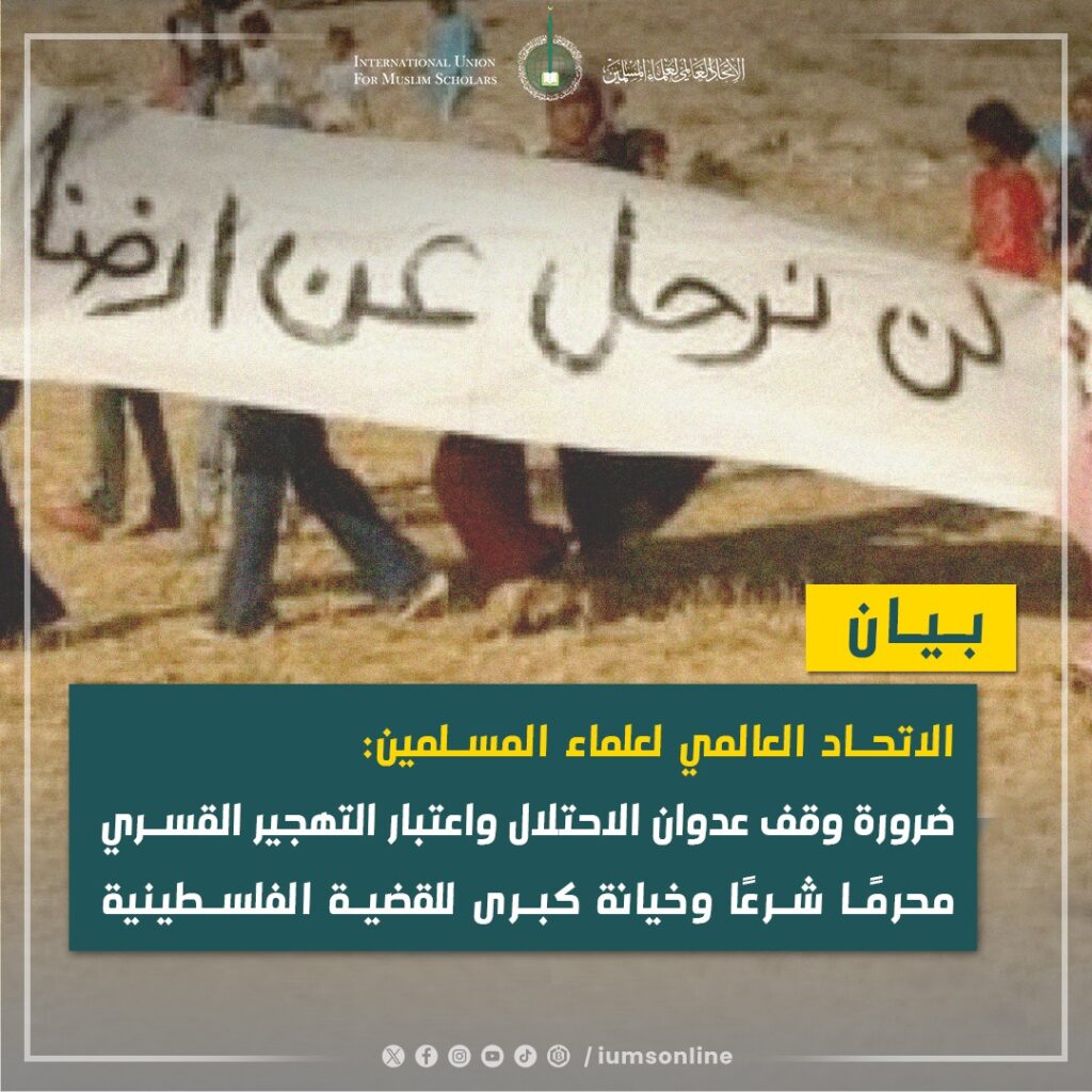 الاتحاد العالمي لعلماء المسلمين: ضرورة وقف عدوان الاحتلال واعتبار التهجير القسري محرمًا شرعًا وخيانة كبرى للقضية الفلسطينية (بيان)
