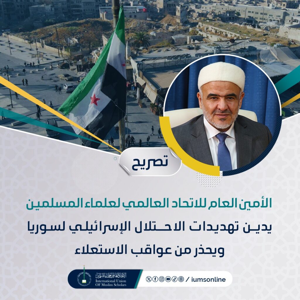 الأمين العام للاتحاد العالمي لعلماء المسلمين يدين تهديدات الاحتلال الإسرائيلي لسوريا ويحذر من عواقب الاستعلاء (تصريح)