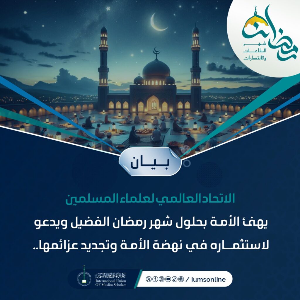 الاتحاد العالمي لعلماء المسلمين يهنئ الأمة بحلول شهر رمضان الفضيل ويدعو لاستثماره في نهضة الأمة وتجديد عزائمها (بيان)