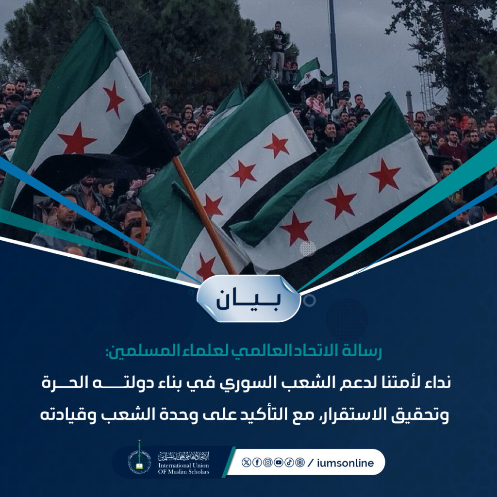 الاتحاد العالمي لعلماء المسلمين: نداء لأمتنا لدعم الشعب السوري في بناء دولته الحرة وتحقيق الاستقرار، مع التأكيد على وحدة الشعب وقيادته