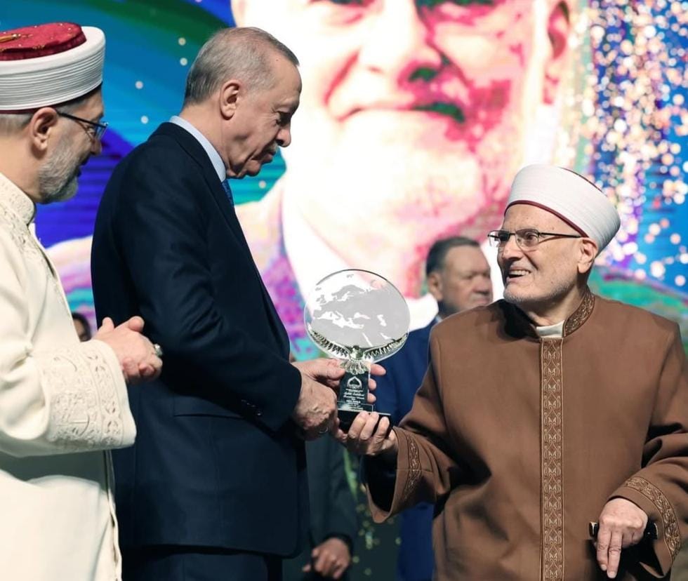 الرئيس التركي رجب طيب أردوغان يكرّم الشيخ عكرمة صبري بمنحه درع الوفاء تقديراً لصموده في الدفاع عن المسجد الأقصى