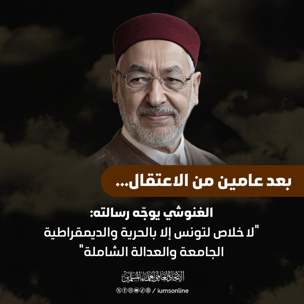الأستاذ راشد الغنوشي يوجّه رسالته: “لا خلاص لتونس إلا بالحرية والديمقراطية الجامعة والعدالة الشاملة” وذلك بعد أكثر من عامين على سجنه