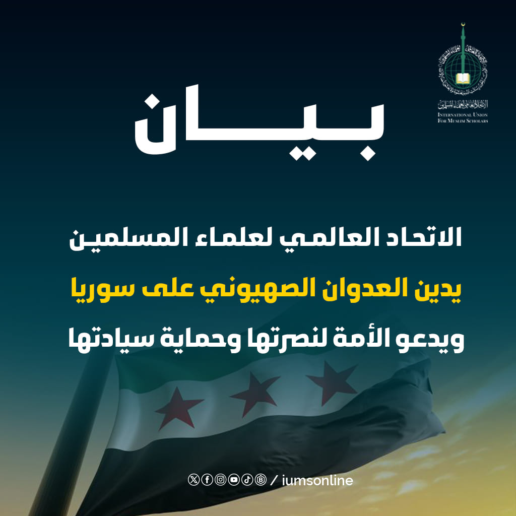 الاتحاد العالمي لعلماء المسلمين يدين العدوان الصهيوني على سوريا ويدعو الأمة لنصرتها وحماية سيادتها