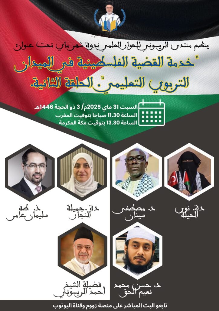 منتدى الريسوني للحوار العلمي ينظم ندوته لشهر مايو تحت عنوان: “خدمة القضية الفلسطينية في الميدان التربوي والتعليمي – الحلقة الثانية”