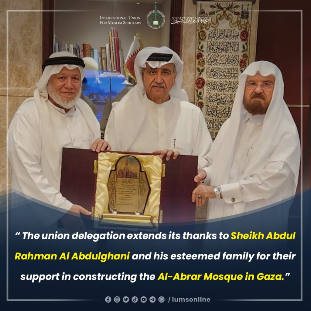 The union delegation extends its thanks to Sheikh Abdul Rahman Al Abdulghani and his esteemed family for their support in constructing the Al-Abrar Mosque in Gaza