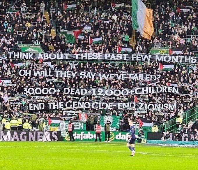 Fans of the Scottish football club Celtic express their solidarity with Palestine and denounce the Israeli assault on Gaza.