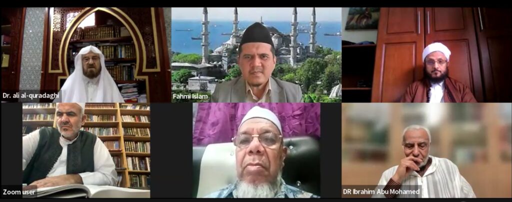 The International Union of Muslim Scholars recently held a virtual meeting via Zoom, attended by its President, Sheikh Dr. Ali Mohiuddin Al-Qaradaghi, and Secretary-General Dr. Ali Muhammad Al-Sallabi, and moderated by Assistant Secretary Dr. Fadl Abdullah Murad. The meeting included participation from scholars across various countries, including Indonesia, Malaysia, the Philippines, China, Australia, and New Zealand.