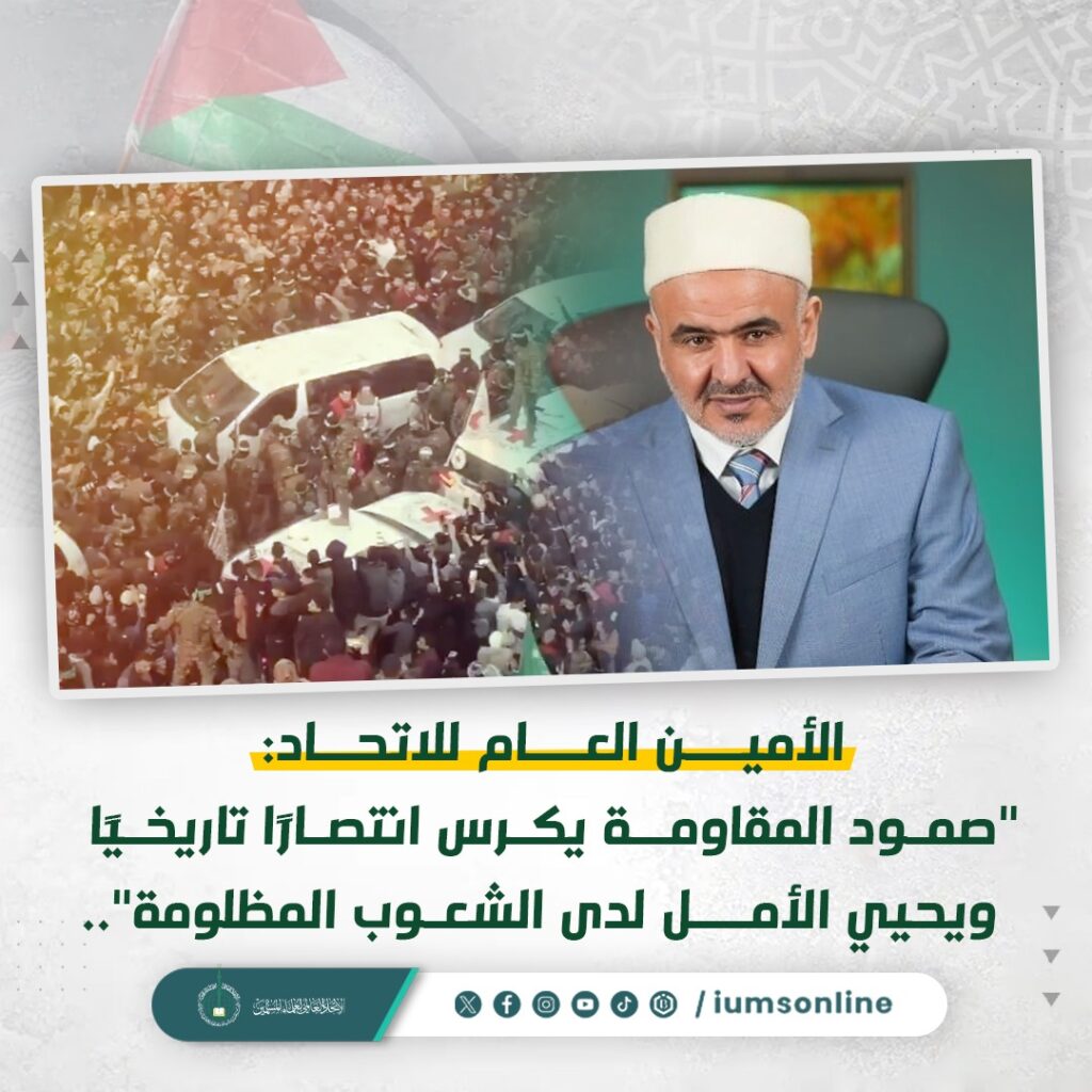 IUMS Secretary-General: “The Resistance’s Resilience Marks a Historic Victory and Revives Hope Among Oppressed Nations”Dr. Ali Muhammad Al-Sallabi, the Secretary-General of the International Union of Muslim Scholars (IUMS), emphasized that…