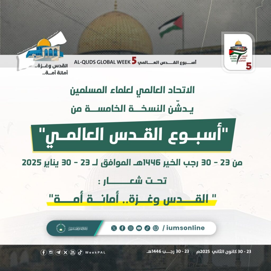 As we live through this decisive moment, with the people of Gaza steadfastly holding onto their land despite all challenges, and on the anniversary of the Isra and Mi’raj, as well as Salahuddin Al-Ayyubi’s liberation of Jerusalem, the International Union of Muslim Scholars (IUMS)—including its leadership, secretariat, and board of trustees—today launches the activities of the fifth edition of “Al-Quds International Week.”