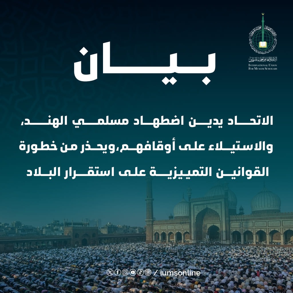The International Union of Muslim Scholars Condemns Persecution of Muslims in India, Seizure of Their Endowments, and Warns of the Danger of Discriminatory Laws on the Country’s Stability (Statement)