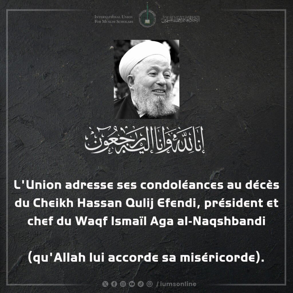 L’Union internationale des savants musulmans présente ses sincères condoléances au peuple turc frère et à la communauté islamique dans son ensemble pour la perte du Cheikh et prédicateur Hassan Qulij Efendi, président et chef du Waqf Ismaïl Aga al-Naqshbandi et successeur du fondateur Mahmoud Efendi, qu’Allah leur accorde à tous Sa miséricorde.
