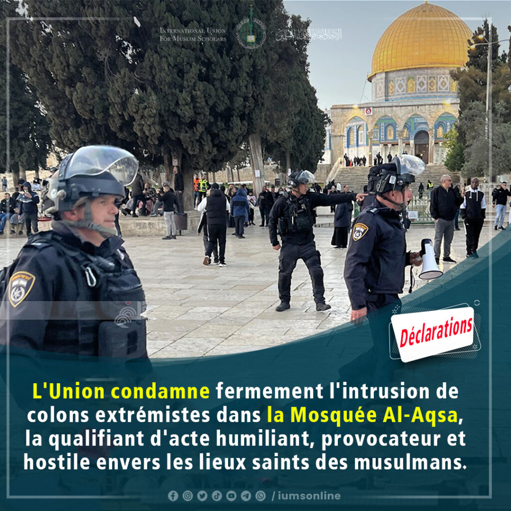 L’Union condamne fermement l’intrusion de colons extrémistes dans la Mosquée Al-Aqsa, la qualifiant d’acte humiliant, provocateur et hostile envers les lieux saints des musulmans.