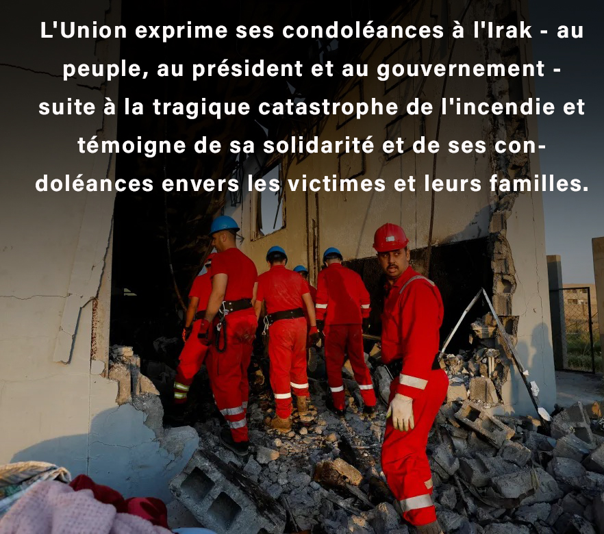 L’Union exprime ses condoléances à l’Irak – au peuple, au président et au gouvernement – suite à la tragique catastrophe de l’incendie et témoigne de sa solidarité et de ses condoléances envers les victimes et leurs familles.