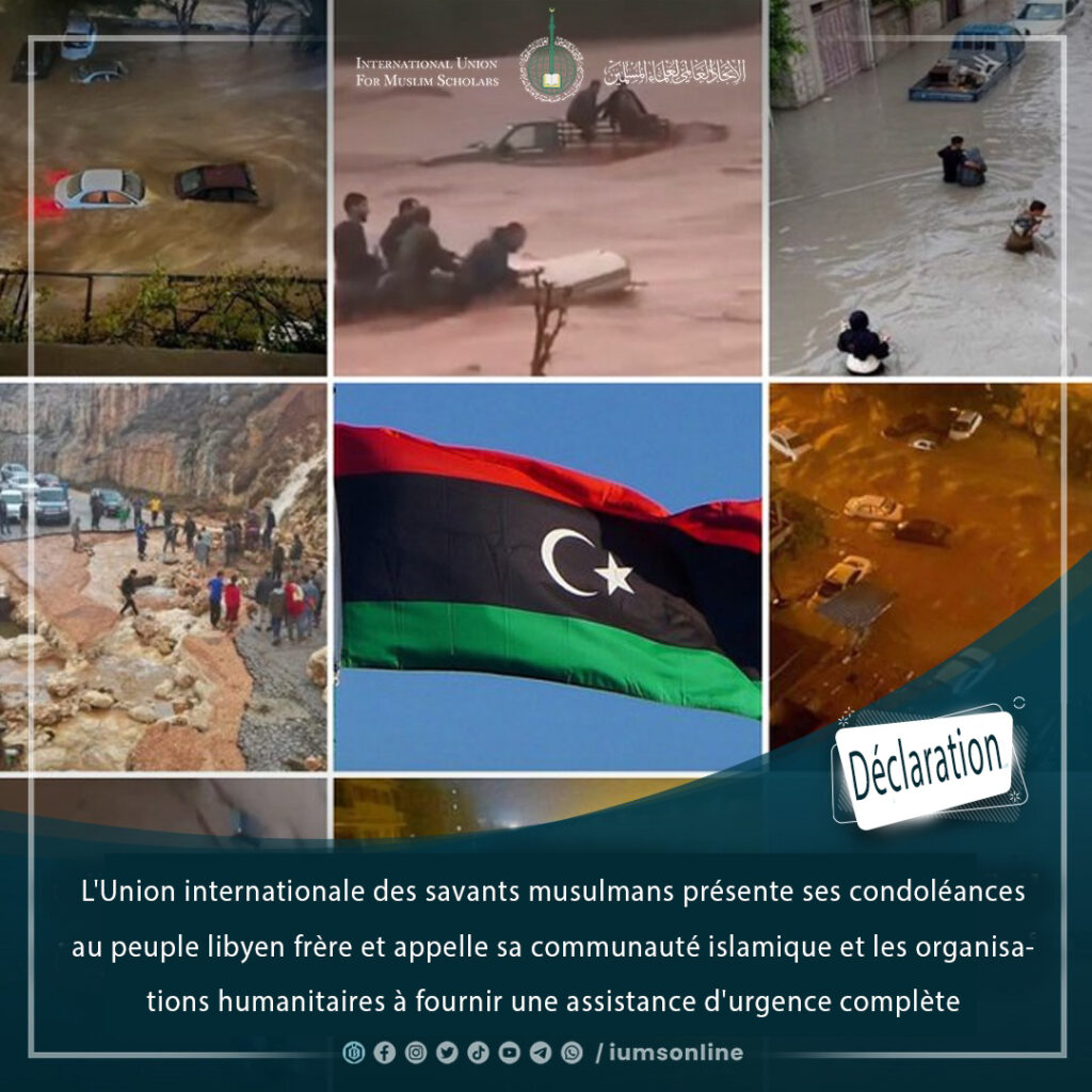 L’Union internationale des savants musulmans présente ses condoléances au peuple libyen frère et appelle sa communauté islamique et les organisations humanitaires à fournir une assistance d’urgence complète (déclaration).