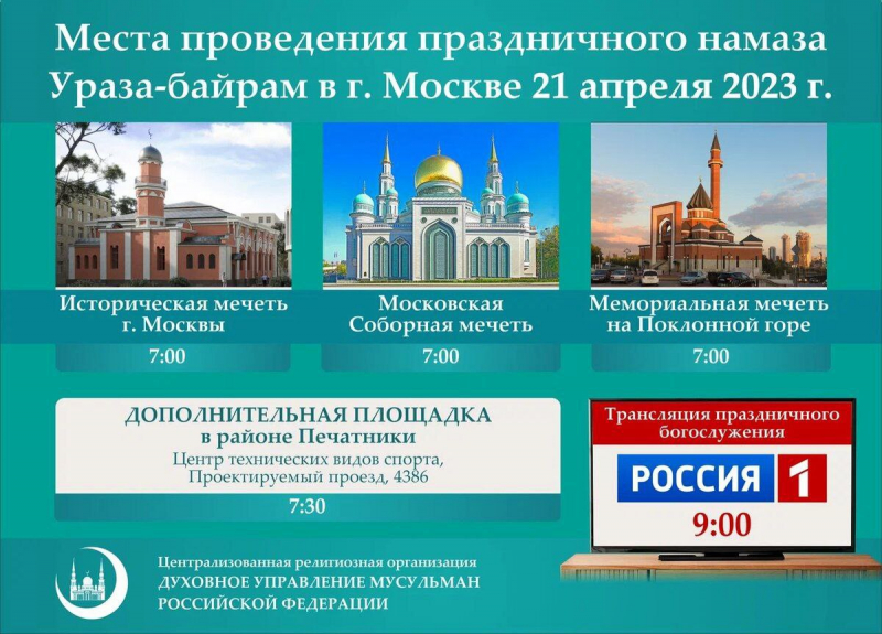 Праздничная молитва в день Ид аль-Фитр – Ураза-байрама 21 апреля 2023 г. в Соборной, Исторической и Мемориальной мечетях Москвы начнется в 7:00 утра. При содействии Правительства Москвы в столичном районе Печатники в Юго-Восточном административном округе в этот день будет работать дополнительная площадка для совершения праздничной молитвы.