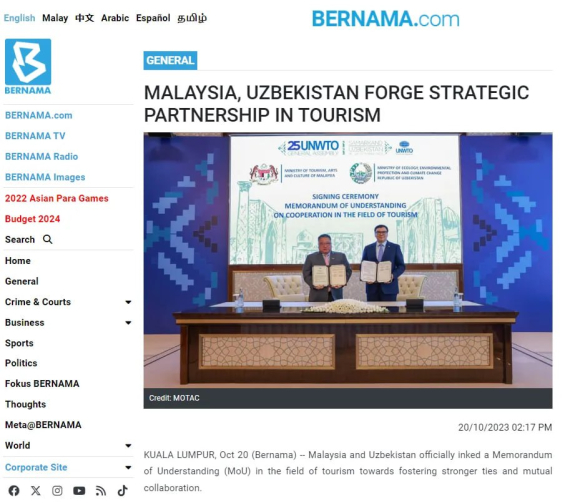 В ведущих СМИ Малайзии опубликованы специальные репортажи о 25-й сессии Генеральной ассамблеи Всемирной туристической организации (ЮНВТО) в Самарканде и подписании Меморандума о взаимопонимании по сотрудничеству в сфере туризма между Правительством Узбекистана и Правительством Малайзии, передает ИА «Дунё».