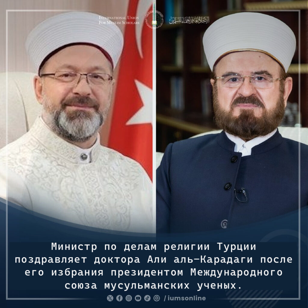 Министр по делам религии Турции, Али Эрбаш, выразил поздравления президенту Всемирного союза мусульманских ученых, шейху доктору Али Мухиддину аль-Карадаги, в связи с избранием его президентом Союза большинством голосов.
