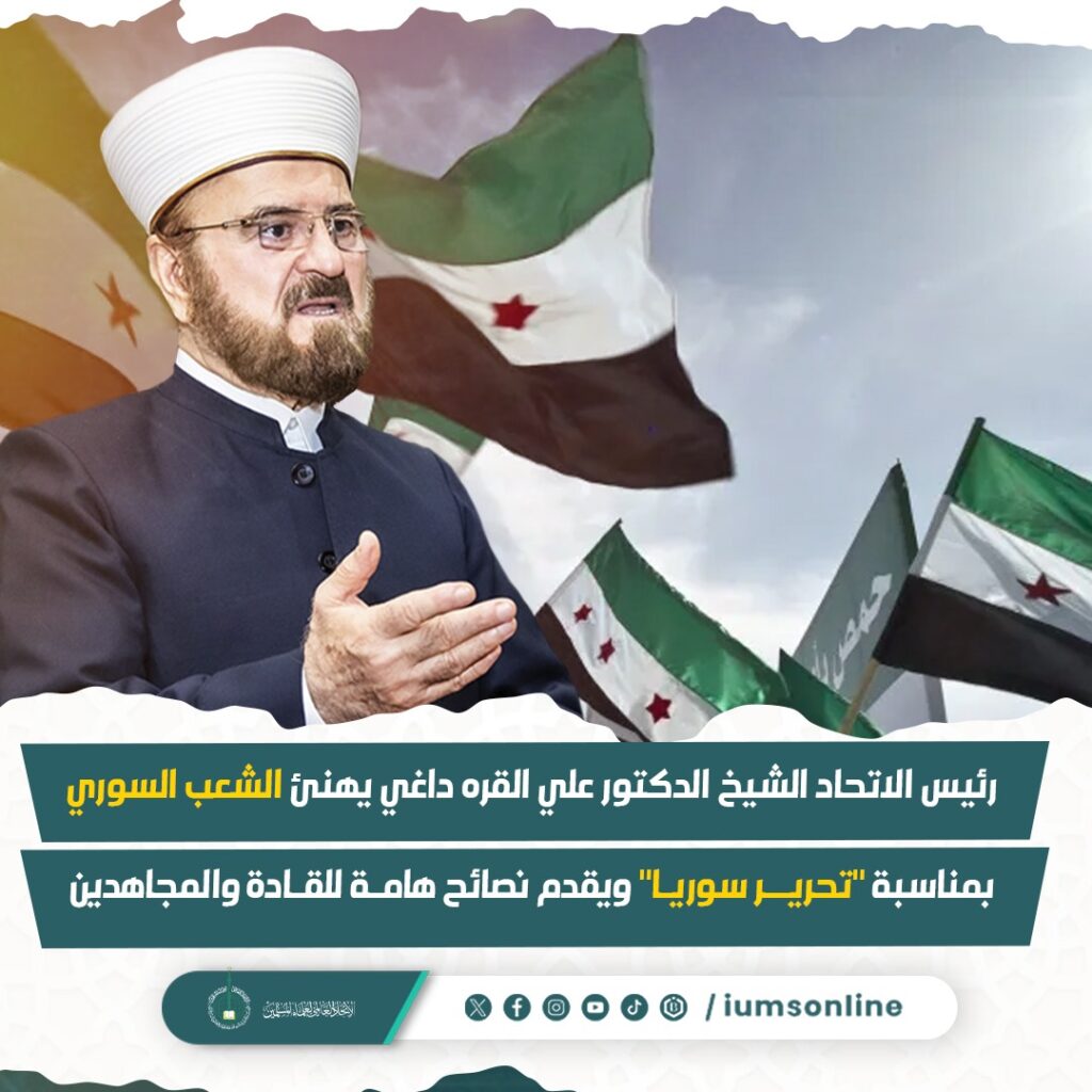 Председатель Союза доктор Али аль-Карадаги поздравляет сирийский народ с «освобождением Сирии» и дает важные советы лидерам и бойцам (видео)