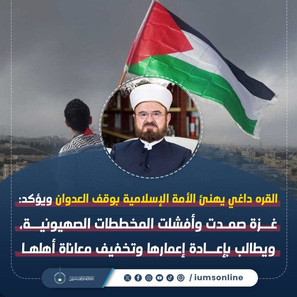 Аль-Карадаги поздравляет исламскую умму с прекращением агрессии и заявляет: Газа выстояла и сорвала сионистские планы, призывая к её восстановлению и облегчению страданий её жителей В сообщении, опубликованном сегодня, в среду,…