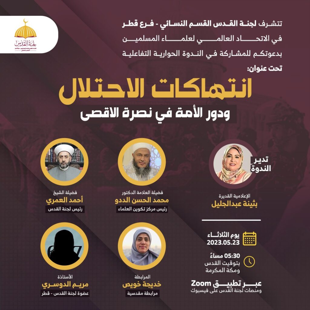 لجنة القدس -القسم النسائي- بفرع قطر في الاتحاد العالمي لعلماء المسلمين، تعقد ندوة حوارية تفاعلية تحت عنوان: “انتهاكات الاحتلال.. ودور الأمة في نصرة الأقصى”