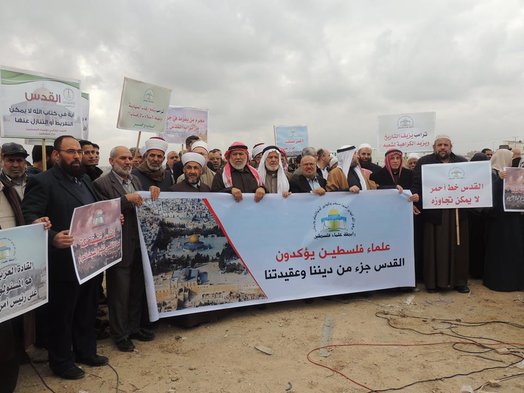 ظم يوم الأربعاء 2017/12/13 الاتحاد العالمي لعلماء المسلمين فرع فلسطين و رابطة علماء فلسطين مسيرة علمائية بعنوان: (وقفة علماء فلسطين وصرخة في وجه ترمب اللعين) وذلك بالتعاون مع وزارة الأوقاف