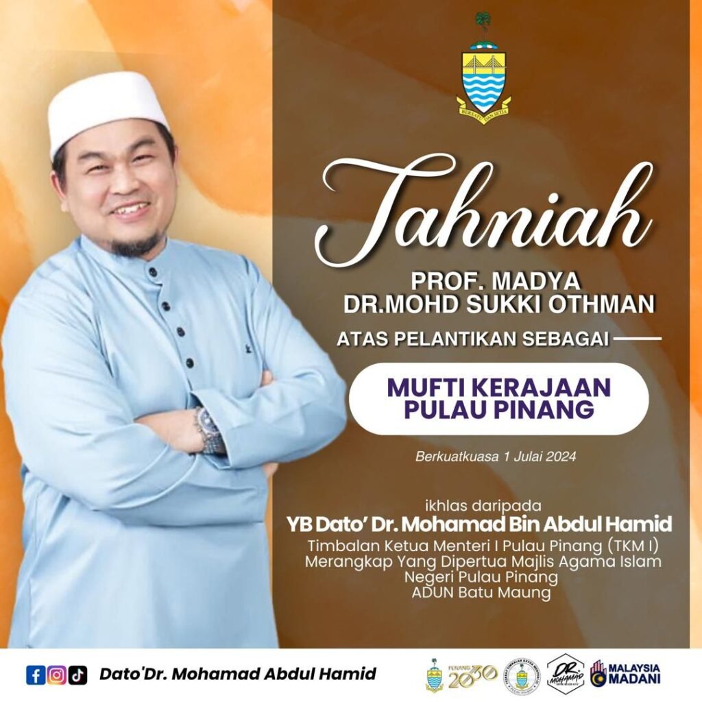 أعلن حكومة ولاية بينانغ في ماليزيا تعيين الأستاذ المساعد الدكتور محمد سوكي عثمان، عضو الاتحاد العالمي لعلماء المسلمين، مفتياً للولاية اعتباراً من 1 يوليو 2024. يتمتع الدكتور محمد سوكي عثمان بسجل حافل من الإنجازات الأكاديمية والخبرات الواسعة في مجاله، مما يجعله مؤهلاً لتولي هذا المنصب الرفيع.
