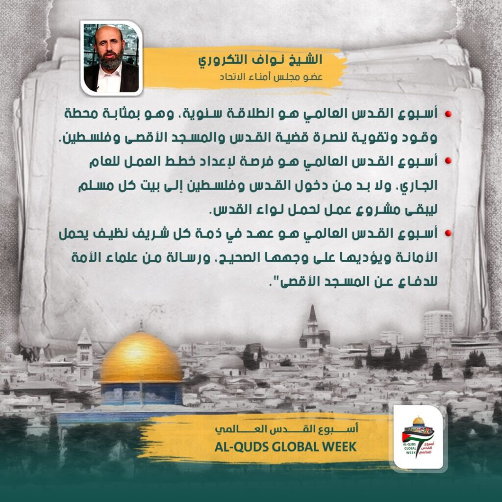 “أسبوع القدس العالمي هو انطلاقة سنوية، وهو بمثابة محطة وقود وتقوية لنصرة قضية القدس والمسجد الأقصى وفلسطين.