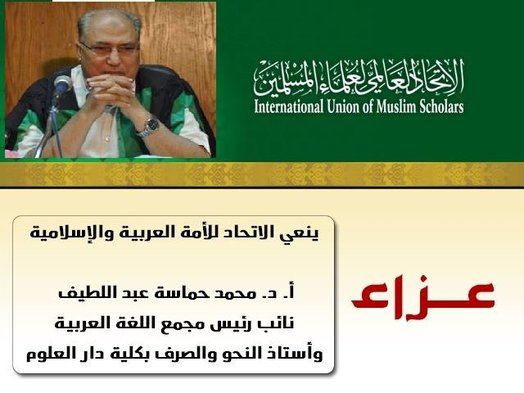 ينعي الاتحاد العالمي لعلماء المسلمين إلى الأمتين الإسلامية والعربية أ. د. محمد حماسة عبد اللطيف – نائب رئيس مجمع اللغة العربية وأستاذ النحو والصرف بكلية دار العلوم (مصر) – ويدعو الله عز وجل أن يتغم