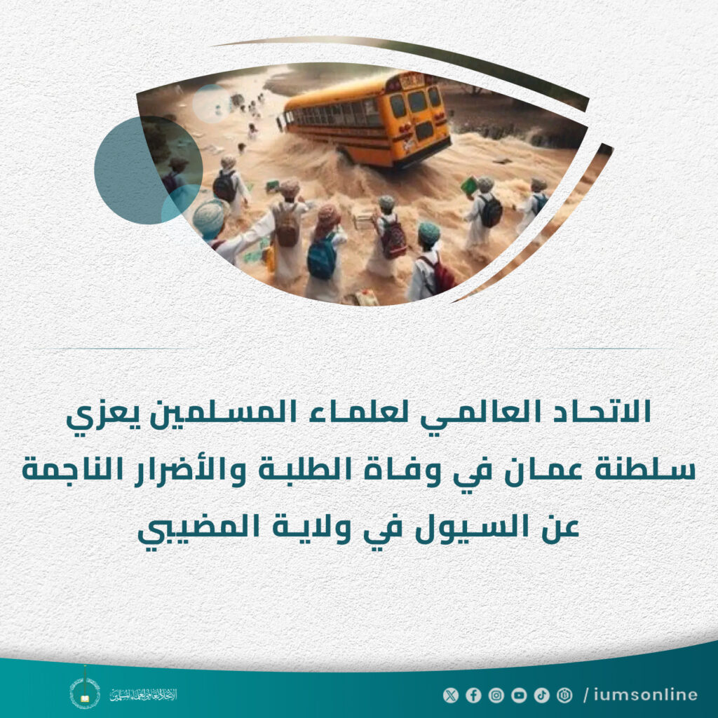 الاتحاد العالمي لعلماء المسلمين يتقدم بخالص التعازي إلى سلطنة عمان الشقيق -سلطاناً، وشعباً، وحكومة- على ما أصابهم من وفاة عدد من الطلبة، والأضرار المادية جراء السيول والأمطار الجارفة التي ضربت ولاية المضيبي في السلطنة