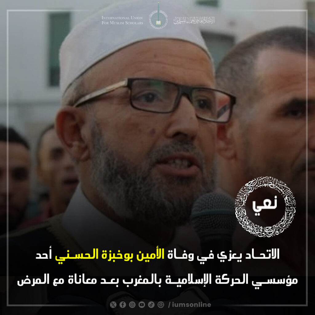 الاتحاد العالمي لعلماء المسلمين يعزي في وفاة الأمين بوخبزة العمراني الحسني أحد مؤسسي الحركة الإسلامية بالمغرب، بعد معاناة مع المرض في الأشهر الأخيرة من حياته اضطر فيها للانتقال مرارًا من موطنه في تطوان والعاصمة الرباط، عن عمر يناهز الـ68 عاما