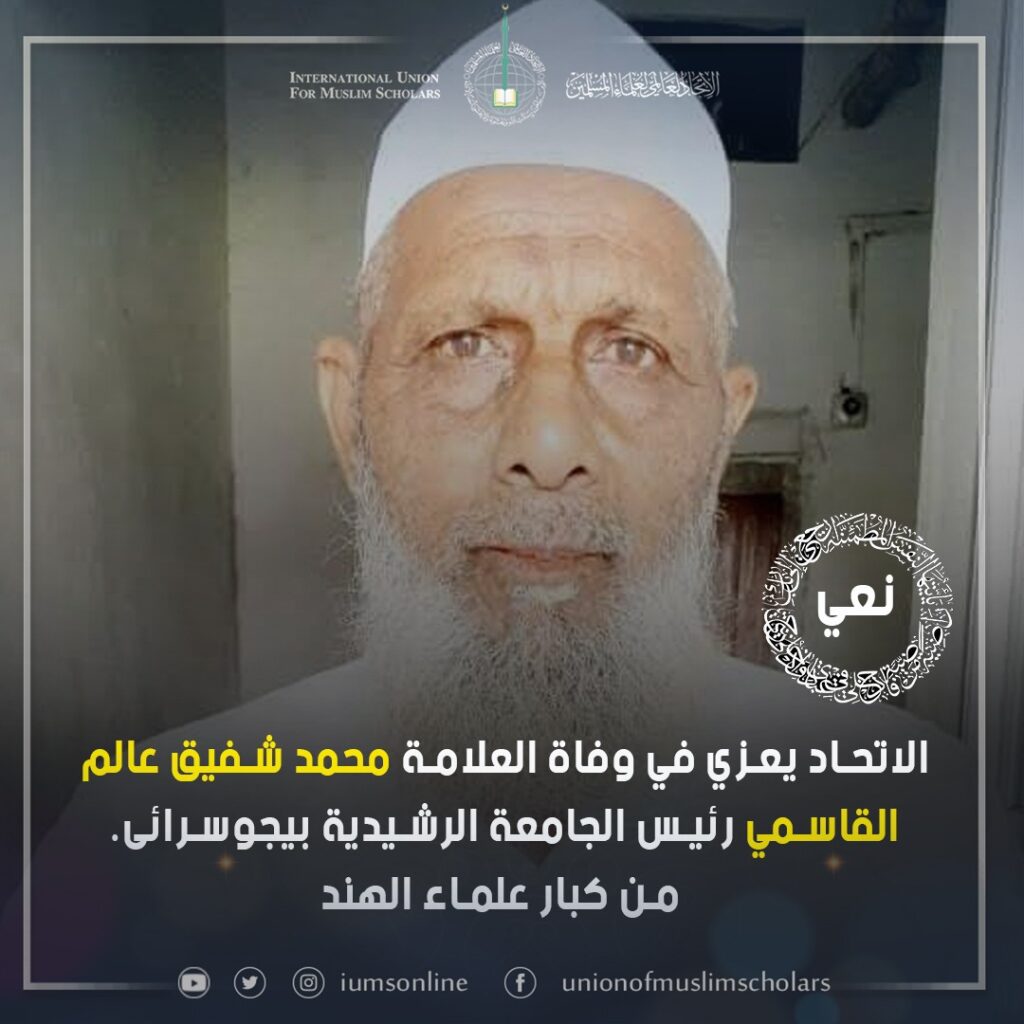 الاتحاد العالمي لعلماء المسلمين يعزي في وفاة العلامة محمد شفيق عالم القاسمي رئیس الجامعة الرشیدية بیجوسرائى وأحد کبار علماء الهند