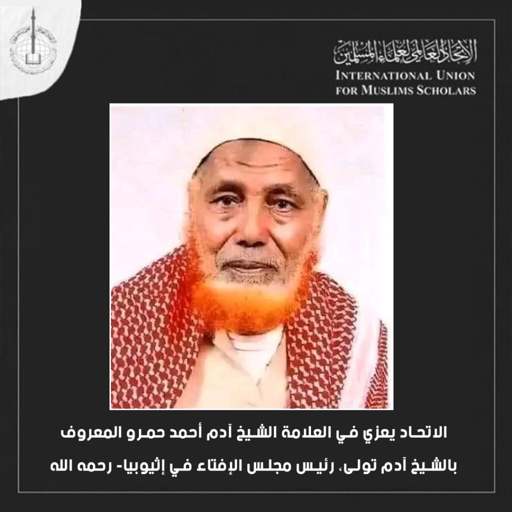 الاتحاد يعزي في العلامة الشيخ آدم أحمد حمرو المعروف بالشيخ آدم تولى، رئيس مجلس الإفتاء في إثيوبيا عن عمر تجاوز مئة سنة، وهو علم من أعلام العلم والدعوة وأسهم بعلمه ونفسه في خدمة الإسلام والمسلمين لأكثر من ثمانين عاماً