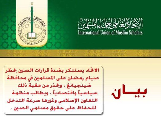 اصدر الاتحاد العالمي لعلماء المسلمين بيانا يستنكر فيه بشدة حظر السلطات الصينية الصيام في رمضان على المسلمين الإيغوريين بمحافظة شينجيانغ، ويدعو الصين إلى احترام حقوق المسلمين ومشاعرهم الدينية ، ويط