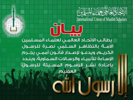 أصدر الاتحاد العالمي لعلماء المسلمين بياناً يحذر فيه من العواقب الوخيمة لاستمرار الإساءة إلى الرسول الكريم محمد – صلى الله عليه وسلم – ، وإلى دينه وأمته ، ويطالب الحكومات بالعمل على إصدار قالاتحاد يحذر من العواقب الوخيمة لاستمرار الإساءة إلى الرسول الكريم محمد – صلى الله عليه وسلم – وإلى دينه وأمته