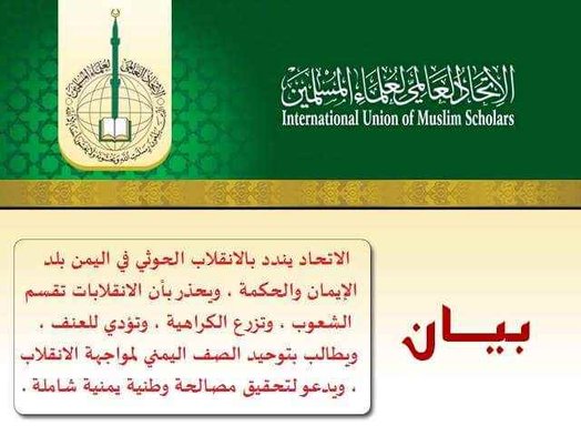 أصدر الاتحاد العالمي لعلماء المسلمين بياناً يندد فيه بالانقلاب الحوثي المسلح على الشعب والسلطة والمؤسسات وثورة اليمن بلد الإيمان والحكمة. ويؤكد أن الحوثي نصب نفسه محل جميع السلطات، ويحذر بأن الانقل
