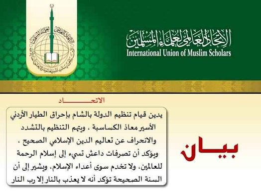 أصدر الاتحاد العالمي لعلماء المسلمين بيانًا يدين فيه قيام تنظيم الدولة بالشام بإحراق الطيار الأردني الأسير معاذ الكساسبة ، ويتهم التنظيم بالتشدد والانحراف عن تعاليم الدين الإسلام