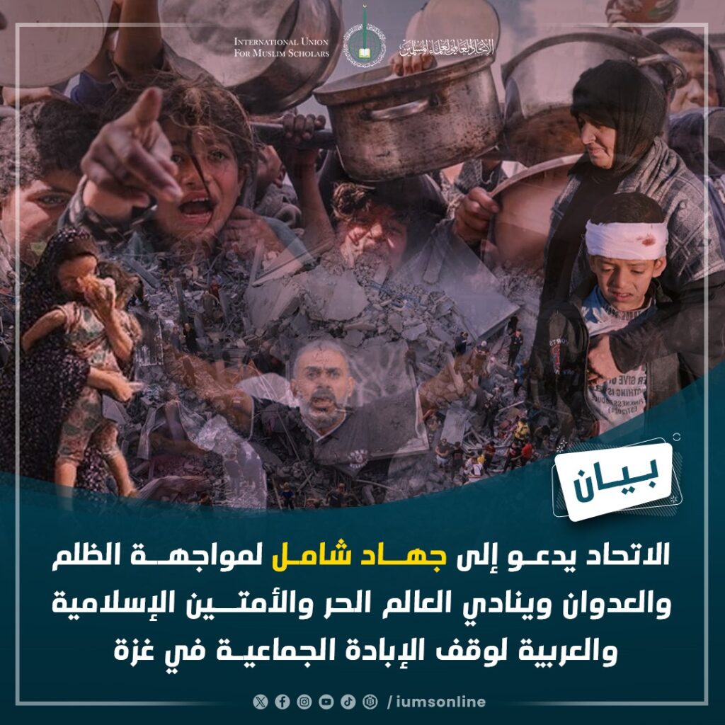 الاتحاد العالمي لعلماء المسلمين يدعو إلى جهاد شامل لمواجهة الظلم والعدوان، وينادي العالم الحر والأمة الإسلامية لوقف الإبادة الجماعية في غزة