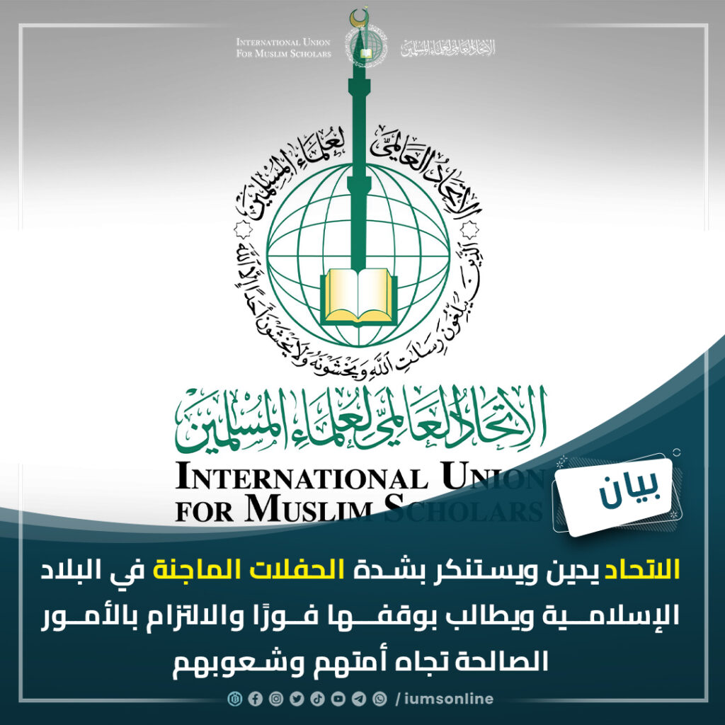 الاتحاد العالمي لعلماء المسلمين يدين ويستنكر بشدة الحفلات الماجنة في البلاد الإسلامية ويطالب بوقفها فورًا والالتزام بالأمور الصالحة تجاه أمتهم وشعوبهم (بيان)
