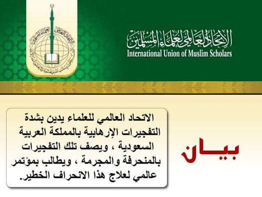 بيان من الاتحاد العالمي لعلماء المسلمينبشأن التفجيرات الإرهابية التي وقعت بالمملكة العربية السعودية قرب مسجد النبي