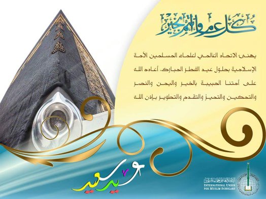 الاتحاد العالمي لعلماء المسلمين يهنئ العالم الإسلامي قادة وشعوباً بحلول عيد الأضحى المبارك، ويدعوهم إلى التضحيات في سبيل تحرير الأقصى وفلسطين، وفي سبيل الوحدة والتعاون والتضامن لنصرة المظل