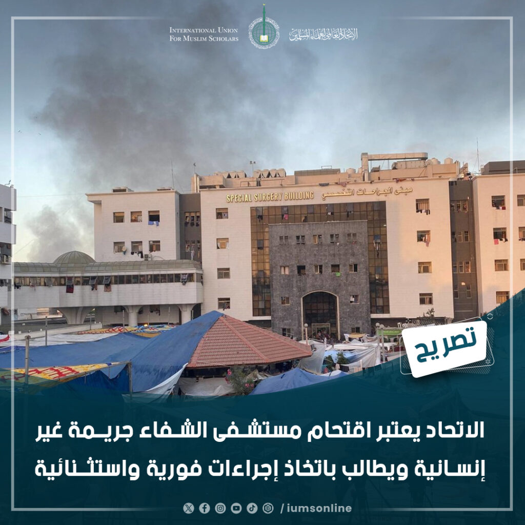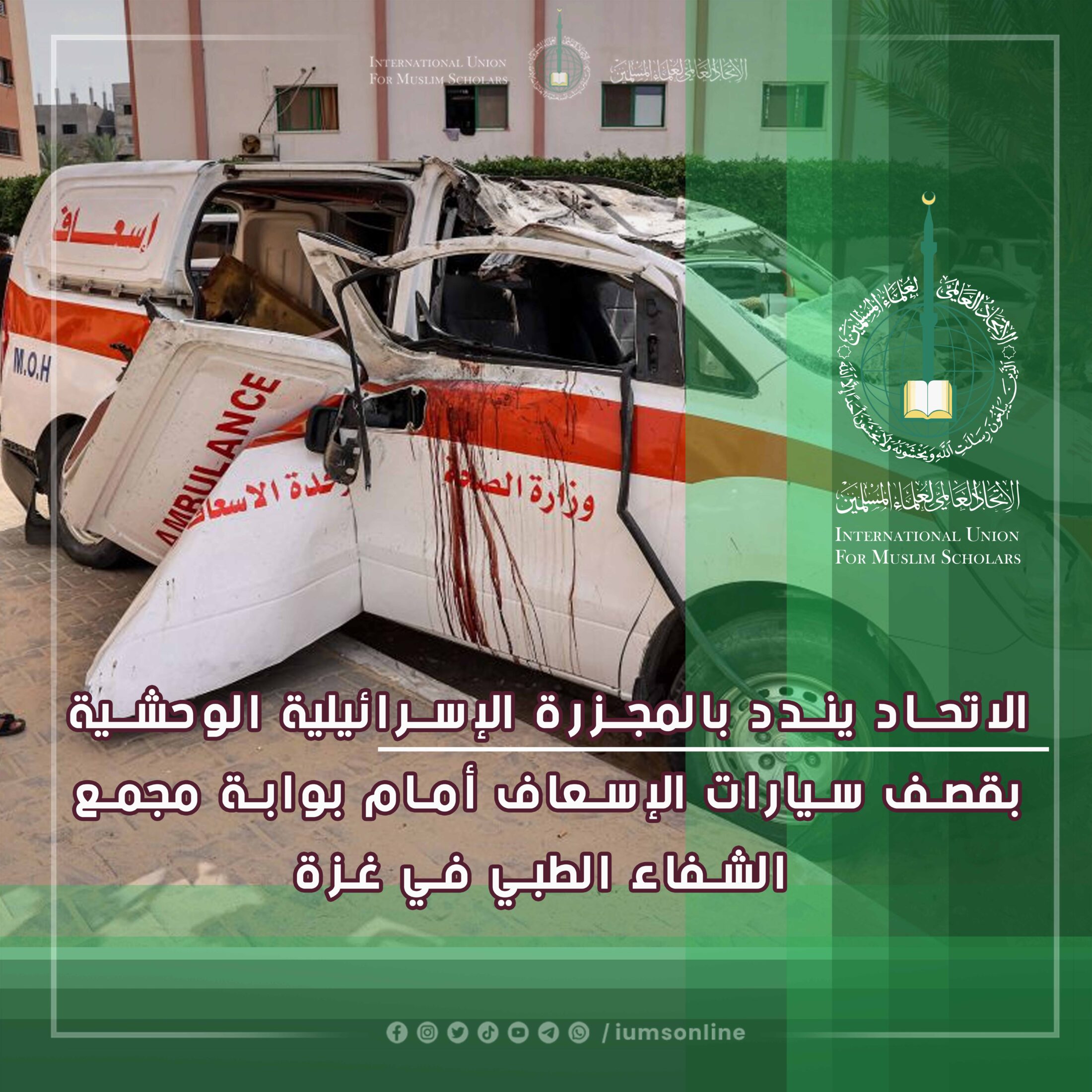 يندد الاتحاد العالمي لعلماء المسلمين بشدة الهجوم الإسرائيلي الوحشي الذي وقع مساء الجمعة، حيث استهدفت طائرات الاحتلال الإسرائيلي سيارات الإسعاف أمام بوابة مجمع الشفاء الطبي في مدينة غزة. هذا الهجوم الغاشم أسفر عن استشهاد وإصابة العشرات من الفلسطينيين الجرحى، الذين كانوا يتلقون العلاج، أو يتم نقلهم إلى المناطق الجنوبية للعلاج في مصر.