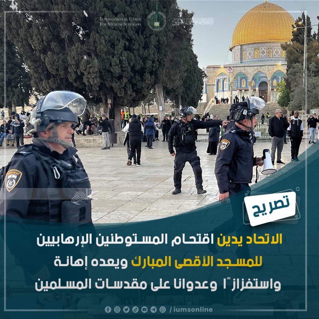 الاتحاد العالمي لعلماء المسلمين يدين بشدة اقتحام المئات من المستوطنين المتطرفين للمسجد الأقصى المبارك، بحماية قوات الاحتلال الإسرائيلي، مخالفا للقوانين الدولية، وتعد من الأعمال الاستفزازية والعدائية، وانتهاكًا صارخًا للأماكن المقدسة للمسلمين ولحرمة المسجد الأقصى المبارك، والعاكفين فيه