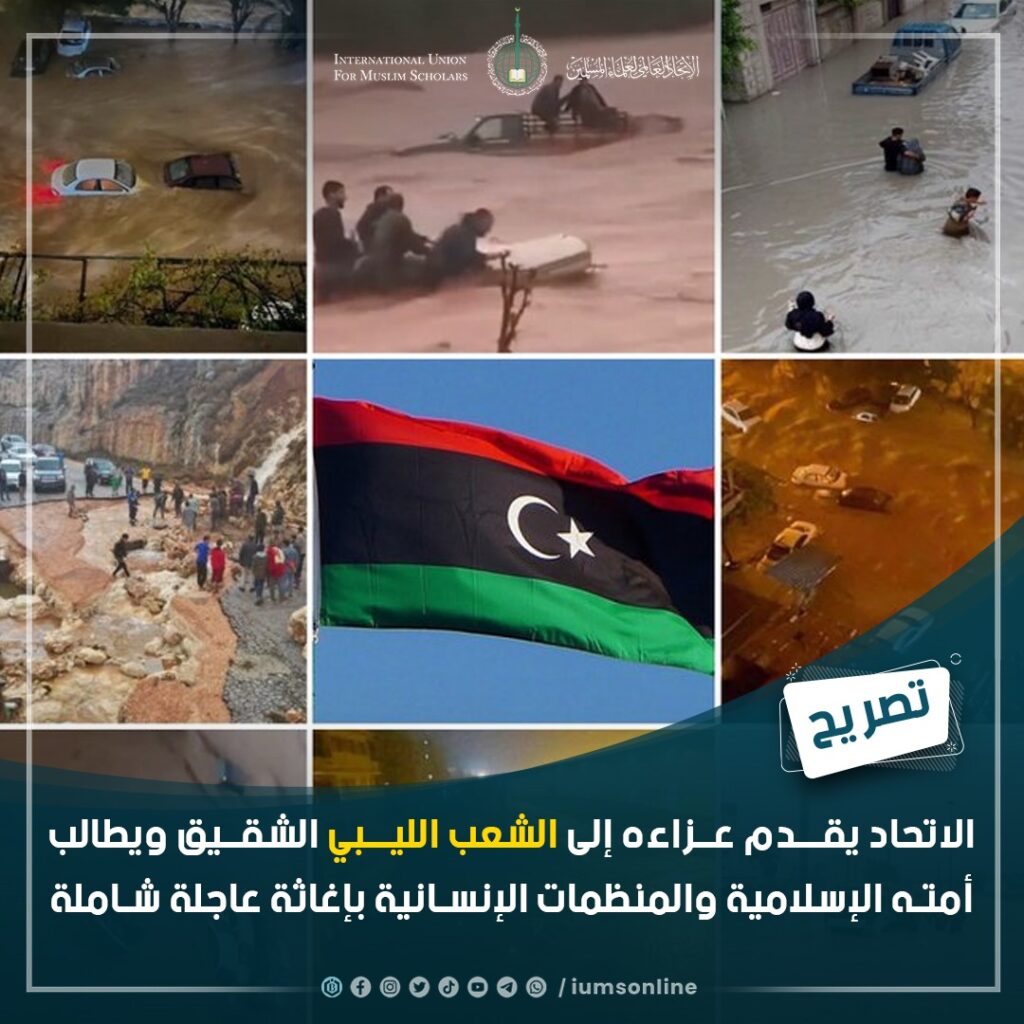 الاتحاد العالمي لعلماء المسلمين يشاطر ليبيا الشقيقة -شعباً وحكومة وقيادات- ألمه وحزنه في هذا الوقت العصيب الذي شهدته مناطق شرقي البلاد نتيجة الفيضانات المدمرة التي اجتاحت عدة مدن وقرى، وخلفت ما يقرب من 2000 قتيلا، ومئات من المصابين والمفقودين (إحصائية مؤقتة)