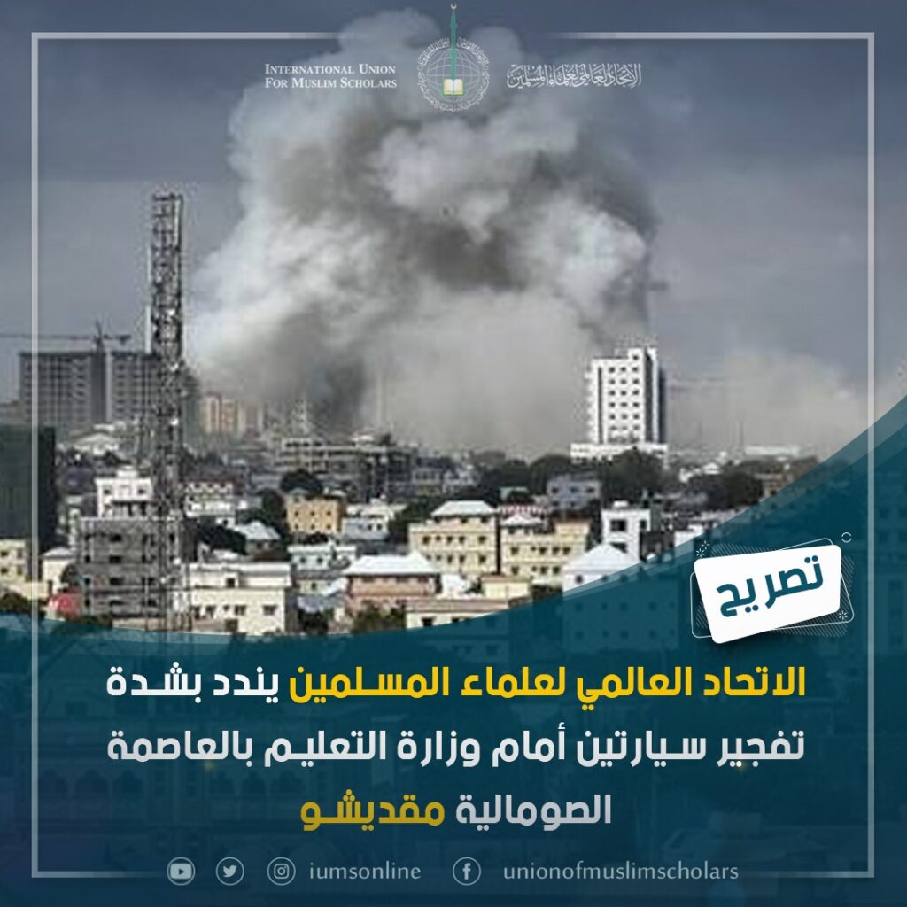 الاتحاد يندد بشدة تفجير سيارتين أمام وزارة التعليم بالعاصمة الصومالية مقديشو، ويؤكد أن الإرهاب لادين، وأنه صناعة لتشويه الإسلام، وتحقيق أهداف أعداء الإسلام، والفوضى الهدامة،