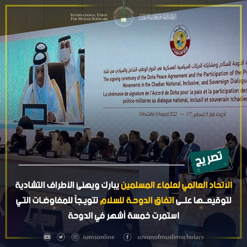 الاتحاد العالمي لعلماء المسلمين يبارك توقيع الأطراف التشادية -السلطة الانتقالية في تشاد، والمعارضة- توقيع اتفاق الدوحة للسلام تتويجاً للمفاوضات التي استمرت خمسة أشهر في الدوحة