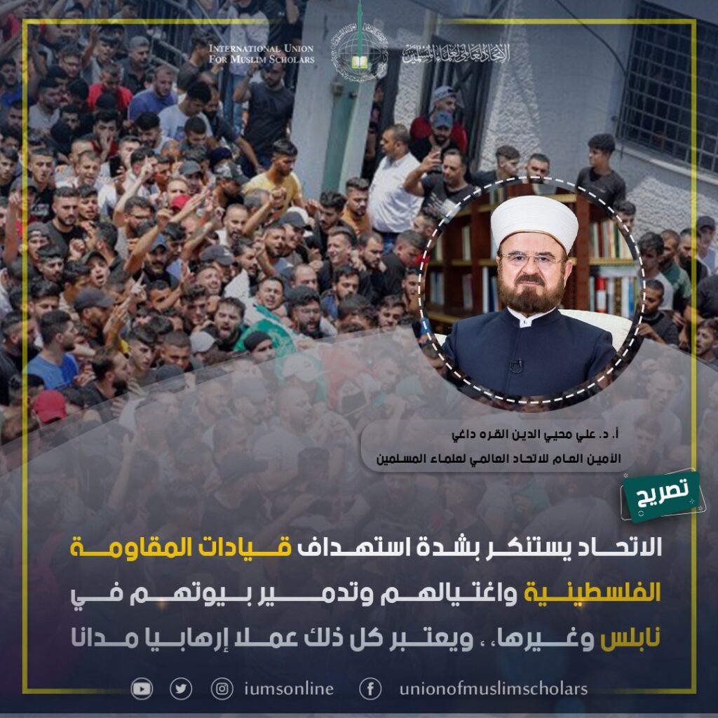 الاتحاد يستنكر بشدة استهداف قيادات المقاومة الفلسطينية واغتيالهم وتدمير بيوتهم في نابلس وغيرها، ويعتبر كل ذلك عملا إرهابيا مدانا، ويدعو إلى حماية الشعب الفلسطيني من عدوان المحتلين في القدس الشريف والضفة وغيرهما